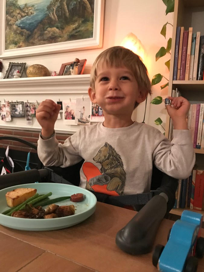 I love food and cooking and I want my son to appreciate it too. I have made it a point through his life so far (2 years 9 months) to expose him to all aspects of food. From growing and buying it to cooking and eating it. My hope is that he will understand how eating a healthy well balanced diet can positively impact his life. This method has worked pretty well so far as he is an adventurous eater, who loves fruits and vegetables. Tonight he ate green beans, roasted potatoes, chicken and brussels sprouts.